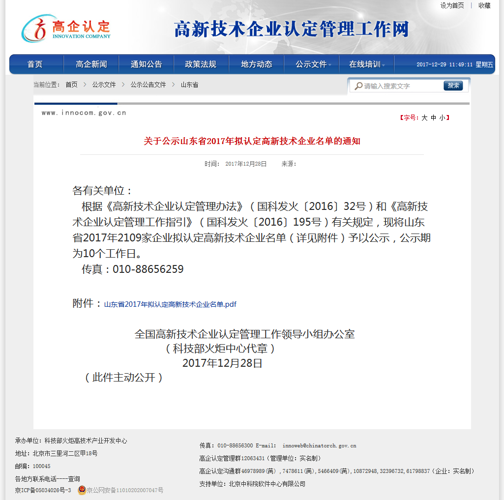 2017年12月26日,高新技術企業(yè)認定管理工作網(wǎng)發(fā)布了“關于公示山東省2017年擬認定高新技術企業(yè)名單的通知”,山東恒力新能源工程有限公司榜上有名。