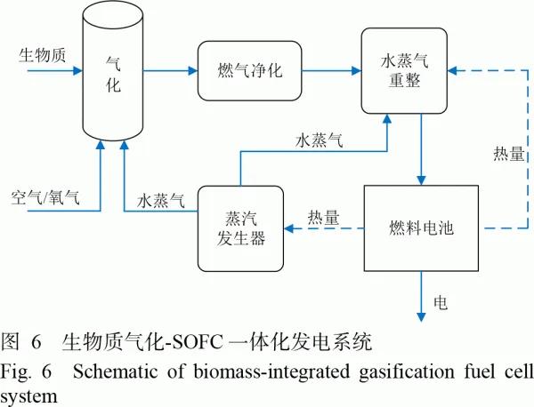 固體氧化物燃料電池(solid Oxide fuel cell,SOFC)技術(shù)突破和規(guī)模化發(fā)展為生物質(zhì)高效分布式發(fā)電提供了一條可行途徑。SOFC在高溫下直接將燃料的化學(xué)能轉(zhuǎn)化為電能,發(fā)電效率可高達60%;對燃料適應(yīng)性比較強,氣化燃氣中可燃組分(H2、CO和CH4)均可作為燃料,且發(fā)電效率不受規(guī)模影響,適合分布式發(fā)電應(yīng)用。生物質(zhì)氣化SOFC發(fā)電流程見圖6。