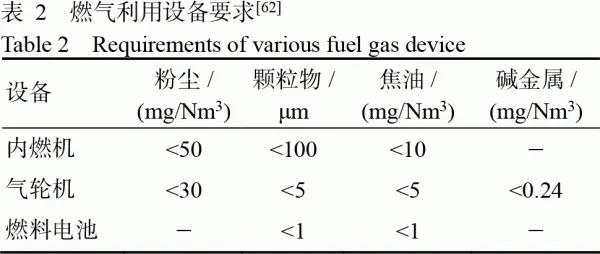 生物質(zhì)氣化獲得的燃氣熱值較低,H2含量較高,容易引起爆燃;生物質(zhì)燃氣中的焦油容易引起點火系統(tǒng)失靈,燃燒產(chǎn)生的積炭會增加機械磨損;燃氣中的顆粒物也會增加設(shè)備磨損,嚴重時引起拉缸。所以生物質(zhì)燃氣內(nèi)燃機的配件損耗和潤滑油消耗一般比其他燃氣內(nèi)燃機高。從氣化爐出來的燃氣需要經(jīng)過凈化處理,內(nèi)燃機和其他燃氣利用設(shè)備對燃氣的要求見表2。