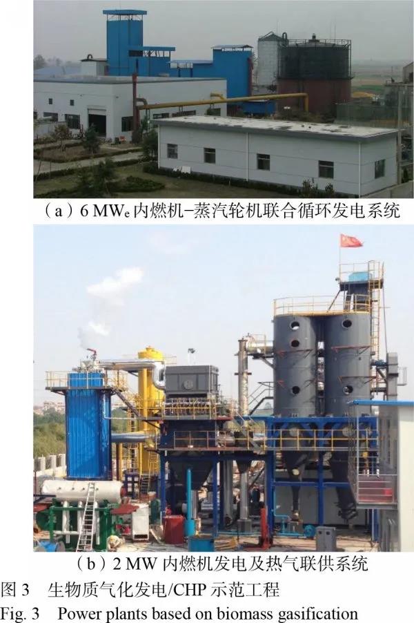 廣州能源研究所在生物質(zhì)氣化?內(nèi)燃機發(fā)電/CHP方面處于國內(nèi)領(lǐng)先水平,已推廣生物質(zhì)氣化發(fā)電/CHP系統(tǒng)近30套。2005?2006年,在國家863計劃支持下,建成國內(nèi)首個生物質(zhì)氣化內(nèi)燃機?蒸汽輪機聯(lián)合循環(huán)發(fā)電示范工程(圖3a),系統(tǒng)裝機規(guī)模為4.5MWe(內(nèi)燃機組)+1.5MWe(汽輪機組),發(fā)電效率超過26%;2012?2014年,在國家科技支撐計劃的支持下,建成“2MWe生物質(zhì)氣化發(fā)電及熱氣聯(lián)供系統(tǒng)(圖3b)”,研制出了發(fā)電效率為34.5%的8300D/M-2非增壓型500kWe低熱值生物質(zhì)燃氣內(nèi)燃機,示范系統(tǒng)發(fā)電效率為25.5%,CHP綜合熱效率為52.3%;目前,在國家重點研發(fā)計劃項目支持下,計劃建設(shè)2MWe生物質(zhì)氣化發(fā)電和熱氣聯(lián)供示范系統(tǒng),將機組發(fā)電效率提高到35%以上,系統(tǒng)發(fā)電效率≥27%,熱電聯(lián)供總熱效率≥50%,目前已完成選址和設(shè)計,進入裝置研發(fā)和加工階段。