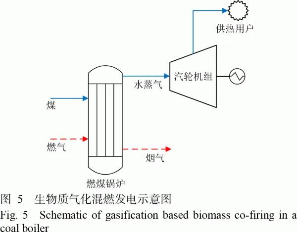 生物質(zhì)氣化燃煤耦合發(fā)電是將生物質(zhì)在氣化爐中轉(zhuǎn)化為燃氣,燃氣再送入燃煤鍋爐與煤混合燃燒發(fā)電,如圖5。
